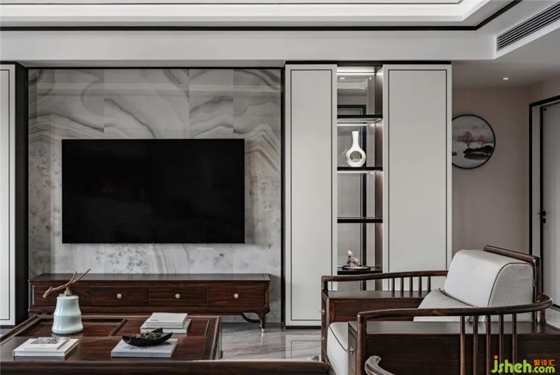 人文雅趣的生活方式,依然是许多现代人心中的追求和向往。龙岩私宅设计居所蕴藏东方,承袭文脉,将传统文化脉络置入庸正的线条中,以客厅为发散点,墨色大理石稳重清雅,线条时尚简约,进一步的丰富了立面造型层次感与品质感。背景是一幅高水流水的写意画,实为高山,虚为流水,源于《列子·汤问》“高山流水”的设计灵感,流水知音,与软装上的木纹相互呼应,为空间增添了些许韵味及古典情愫。