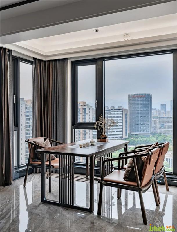 泡茶区与室外景色的糅合相衬,龙岩私宅设计茶具与雅澹的小品点缀其中,令人在东方的韵味中找寻更多现代生活的雅趣。温一壶茶,清冽甘如饴;茶浓配上饼香,生活的样子,细腻而温柔。