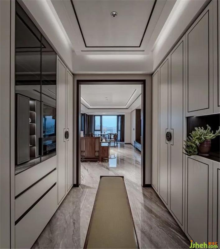 衣帽间与客厅相隔的整面墙体以门洞设计,淡雅设色、典雅布局、与金属把手的古铜色,呈现出清亮的质感魅力,复古感的摆形构出一个极具格调的精神宁谧地带。花艺是空间的妙笔,恰到好处地呈现了一个极具现代东方美感的世界。