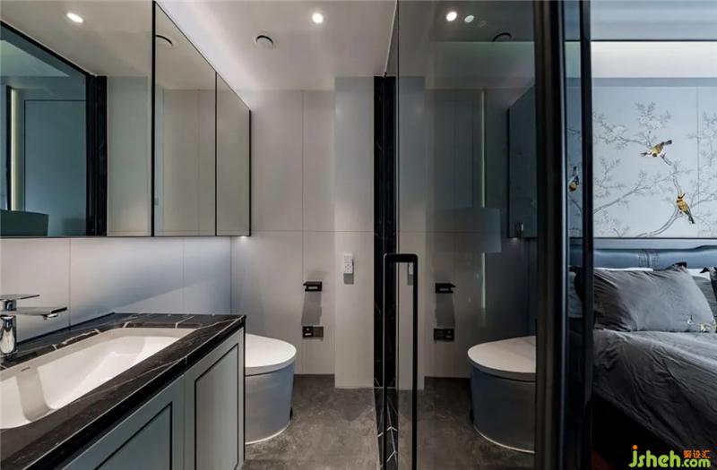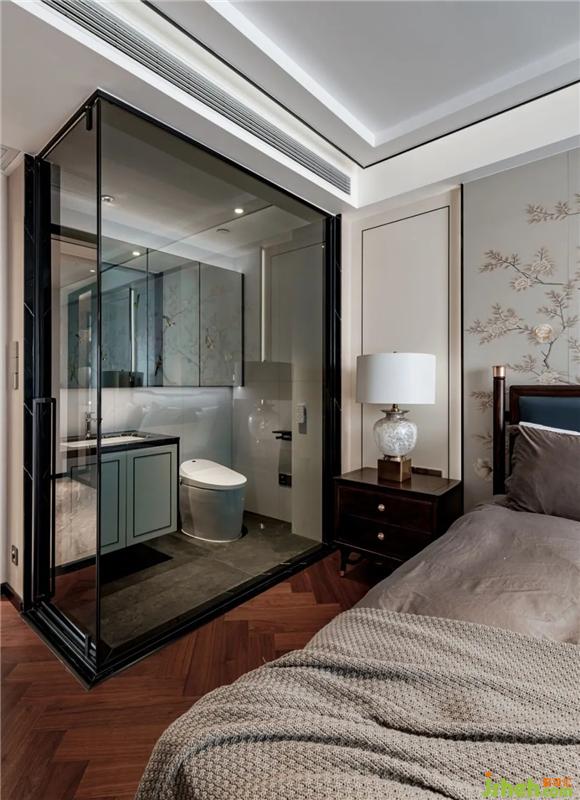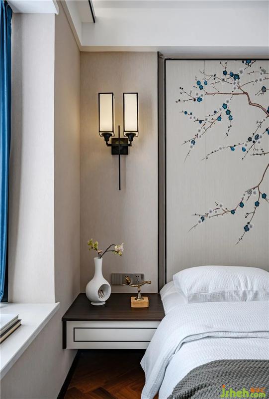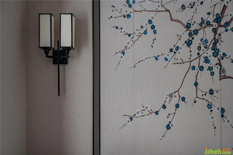 步入次卧,龙岩私宅设计床头背景墙上,一幅梅花营造静中之境,剔除琐碎的装饰,与特殊定制的床头与边柜形成呼应,简洁的形式、柔和的线条,清寂的装饰,不同材质与肌理的碰撞,让人不觉漫游在传统与现代交织的艺术世界。