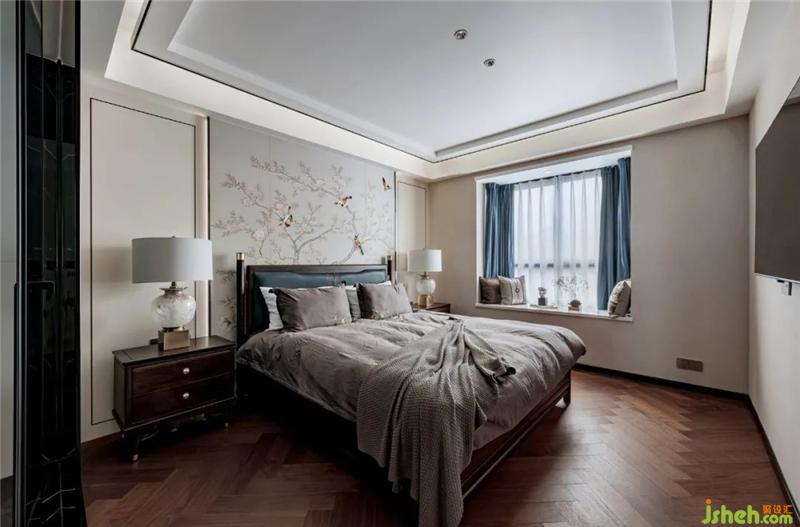龙岩私宅设计主卧延续客厅的素雅静谧,却一改水墨意境,树枝上的嬉闹的燕雀,带回春天的洋洋暖意与灵动的氛围,也寓意着“比翼双飞”的美好祝愿。