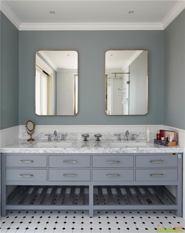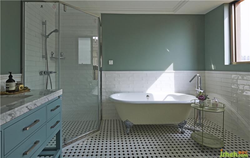 主卫则是另一番光影,绿色交织着白色,透过玻璃、镜面、光面瓷砖,显得格外优雅灵动,仿佛复古油画般的空间质感,使身心得以放松、心灵得到治愈.