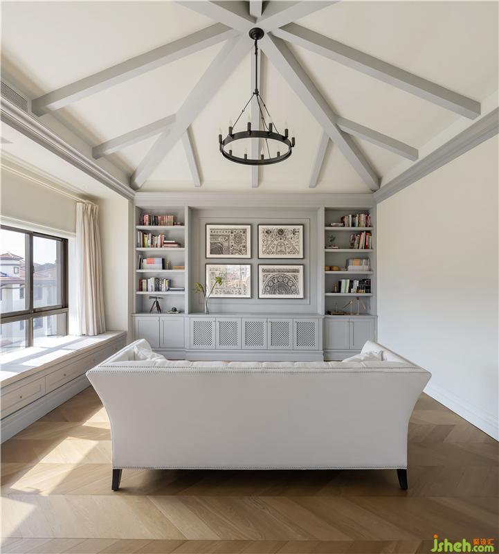 屋顶以蓝色、白色、木色构成,雪花状的天花板设计也十分独特,意象从物质过渡到精神追求.光从拱形窗落下,自由流动其中.