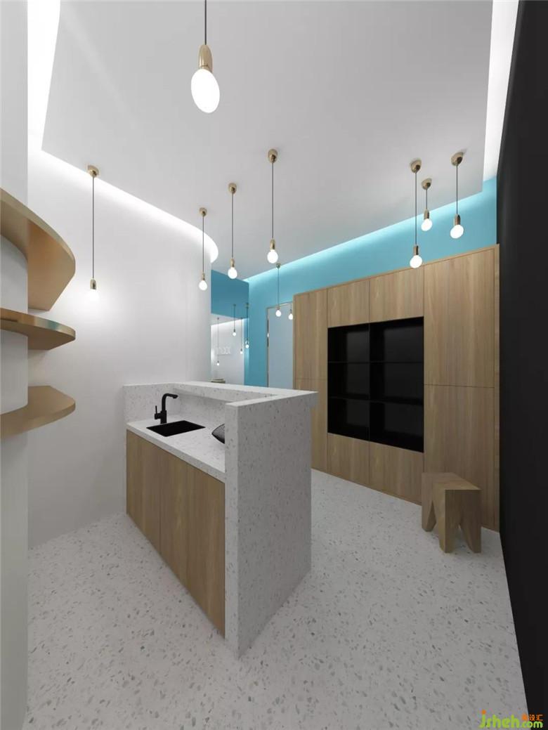 白色和蓝色切割,它们是平的,也是立体的,从地面墙面到天花。