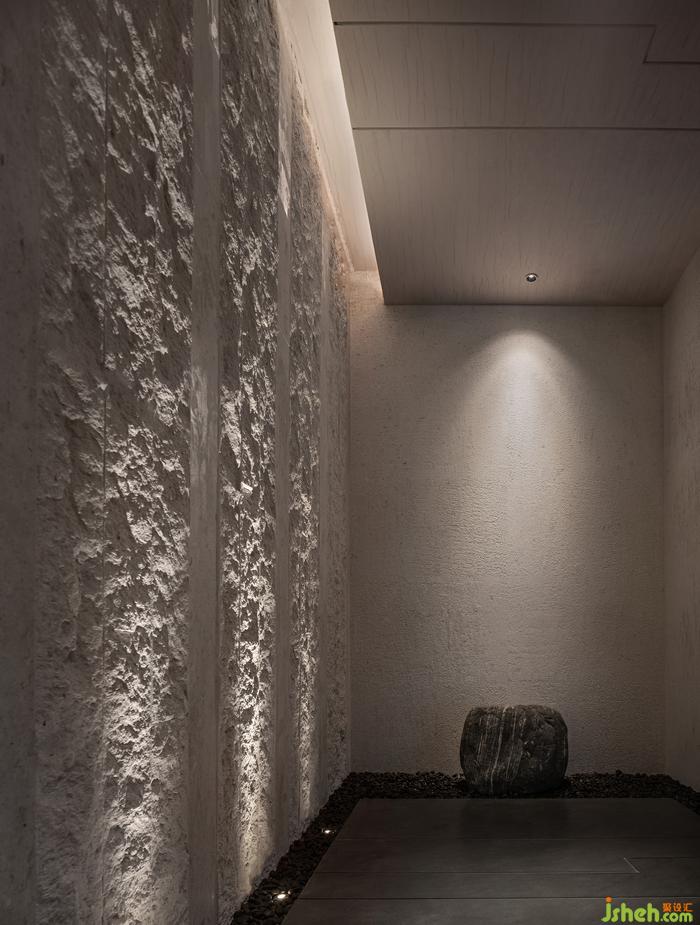 入此空间,行云流水的石材表现手法以当代形式转化,价值再现。会所装修设计连接墙体的本味稻草泥涂料、水墨石、绿植来点缀。介入灯 光设计营造月光下的空间意境。平面上采用了回游的布局,以端景半透明内外来衔接,人、自然、空间、和谐与共。