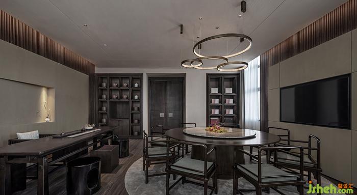 君如墨,伊似水,水与墨,在前世里结缘,在今世里缱绻进入乾园“智慧厅”。点燃香炉闻香,品茶、商论、佳肴等智慧探讨的发酵交集。在智慧力量的面前,在空间里造物,会所装修设计师融入“天工开物”的意念回归空间本真,对自然力的遵从心计精巧地应用了形式设计。