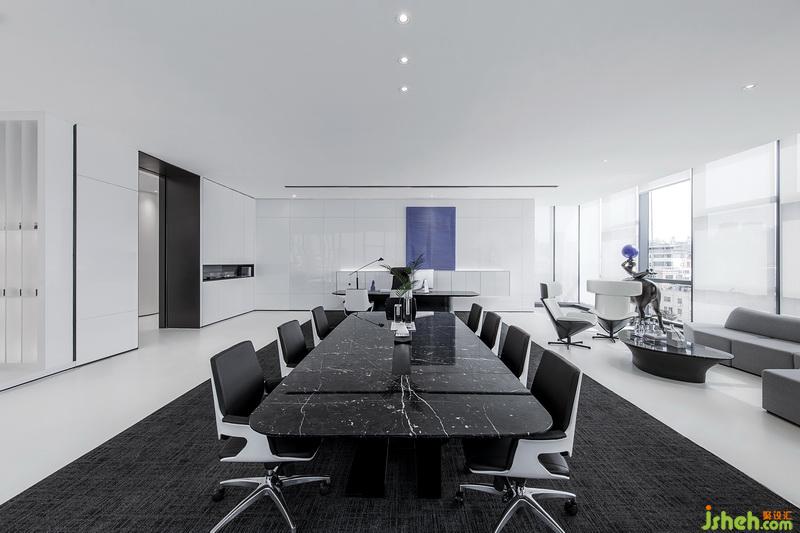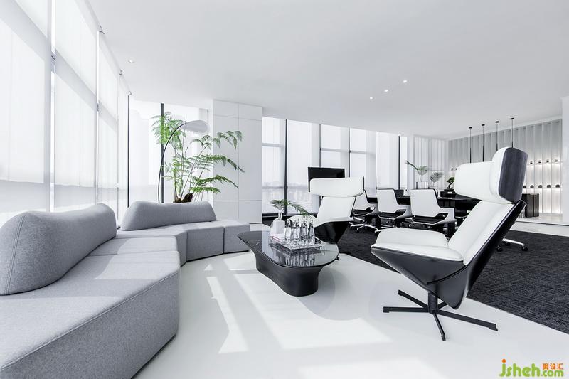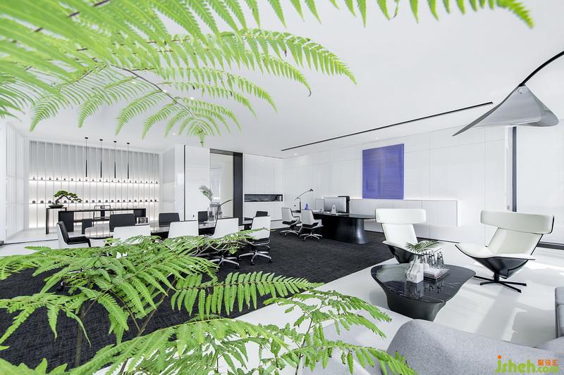 全案大面积铺以高纯度白色,同时以黑色作为辅色,于空间中进行调和,显现公司的现代感与科技感。设计师同时在室内多处放置绿植,柔和空间科技感,增加人文自然气息。一抹抹绿意是一转眼的惊喜,也是工作上的舒缓。所采用的落地玻璃窗将外景引进,深圳的日与夜变成室内一幕,俯览这座城,将城市之景尽收眼底。