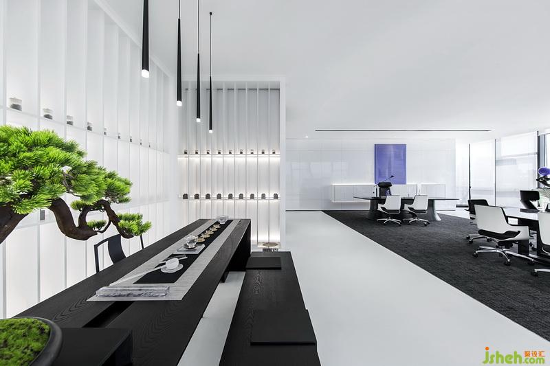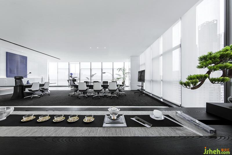 总经办增设茶艺区,采用新的现代手法,于室内造雅致之境。木质茶台送古韵,葱绿盘景点诗意。茶香飘于室内,慰藉日常的疲劳。