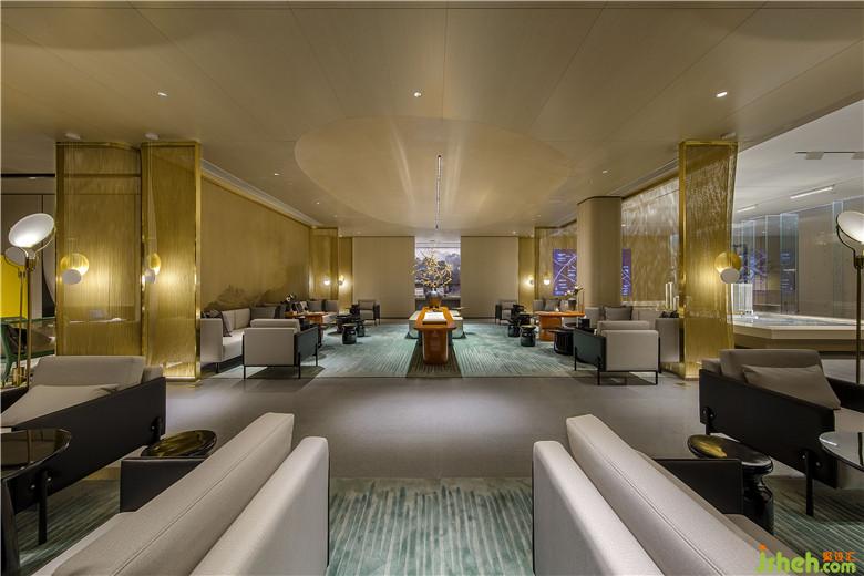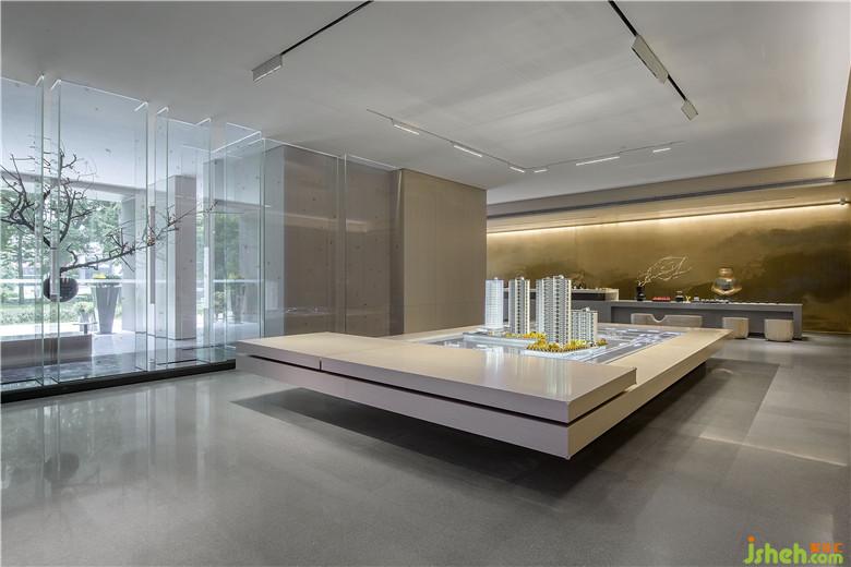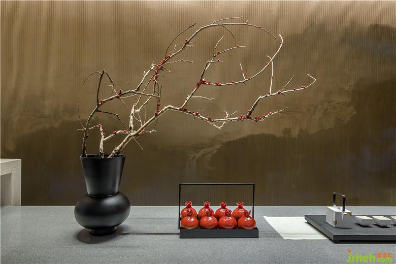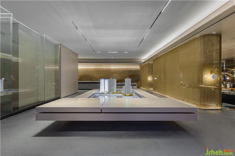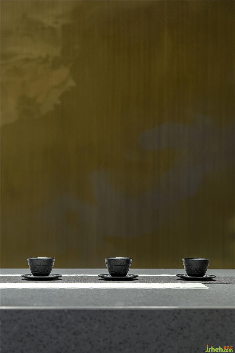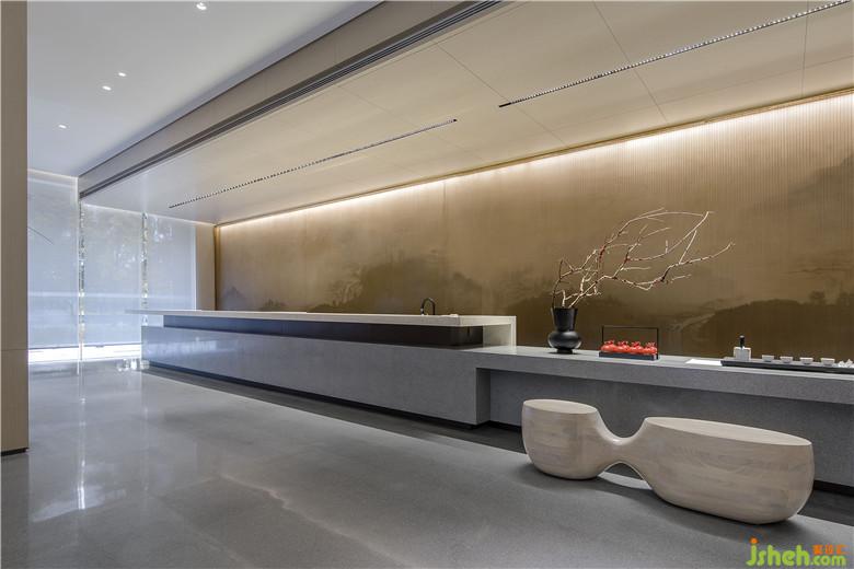 参观者进入接待处,藉由茶台产生几分亲近感,加之背景墙山水画的贯穿,犹如品茗于山水之间,尝一杯诗意,于空间中自得闲适。