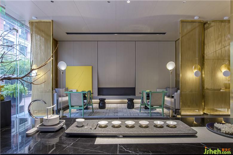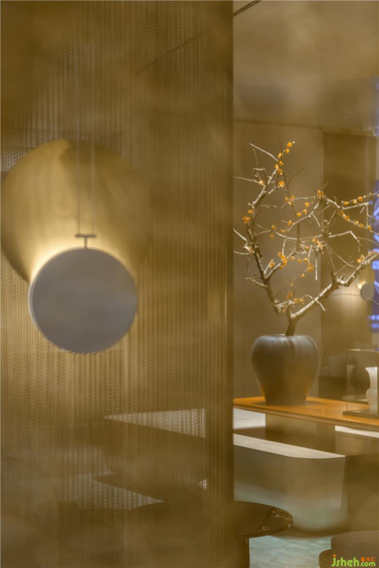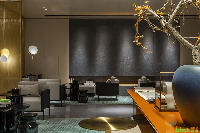 洽谈区内可见淡雅的山水画卷舒展于空间当中,渲染了独特的文人意境。洽谈座设色柔和清雅,低调的灰度与端庄神秘的黑色进行对话,奠定空间清朗的基调。时尚橙色调作为跳色,为空间注入了现代气息,让传统与现代,融合其中。