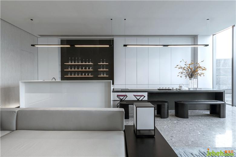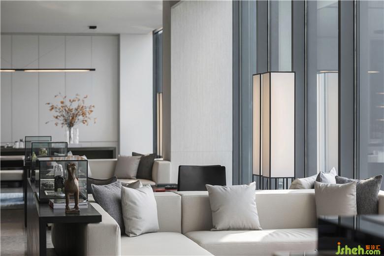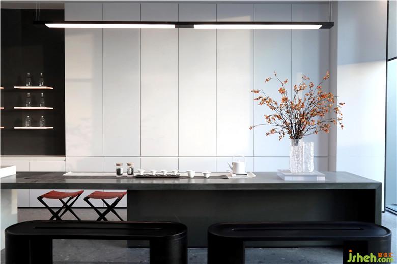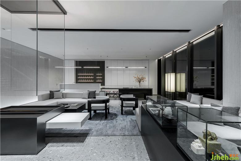 深蓝单人座椅与长形灰白沙发,柔和了空间的质感,让软装充满素雅的基调。无论是洽谈圆桌,或是黑色茶几,皆赋予空间秩序般的美感。