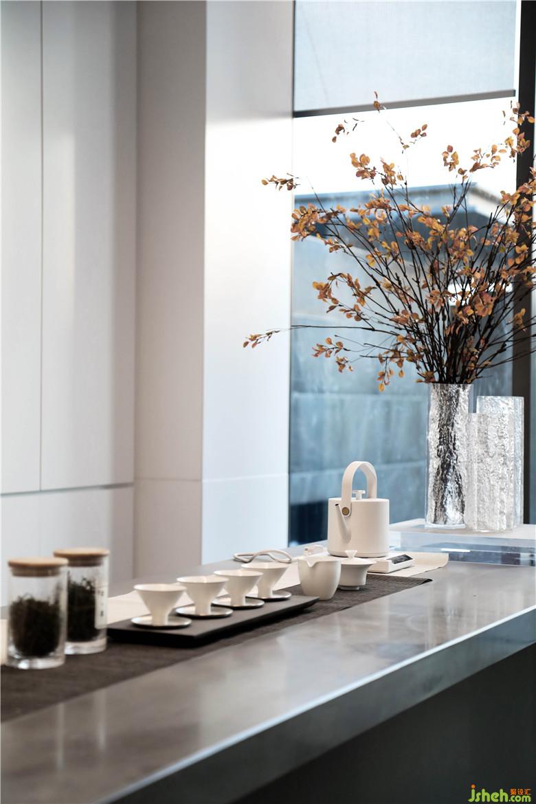 水吧区线条干净简约,素雅花艺让局部更柔美,茶香飘扬于室内,无事闲坐,望水听风,品茗于此,享受此刻之间的惬意。
