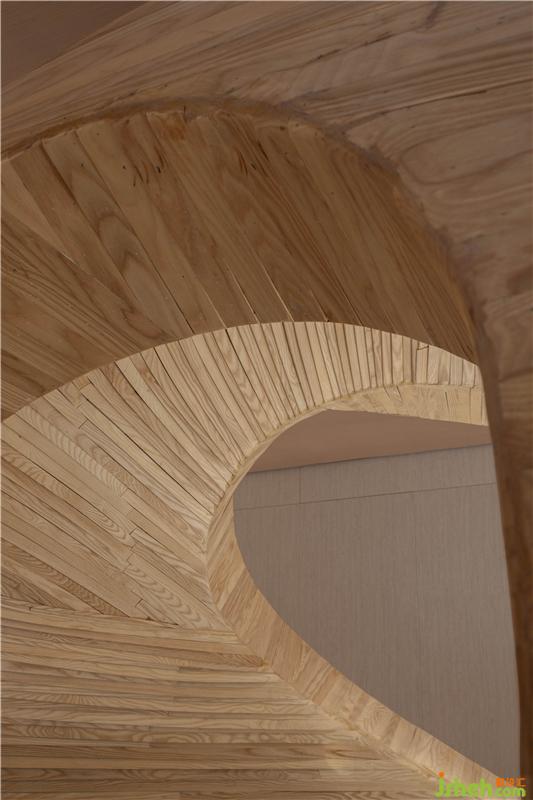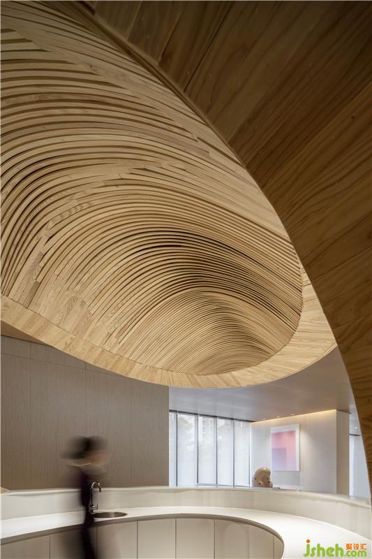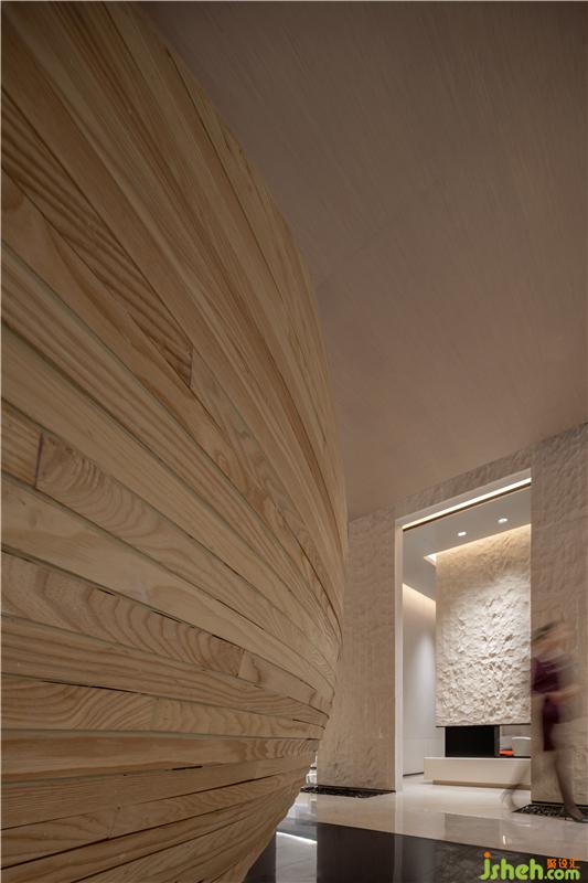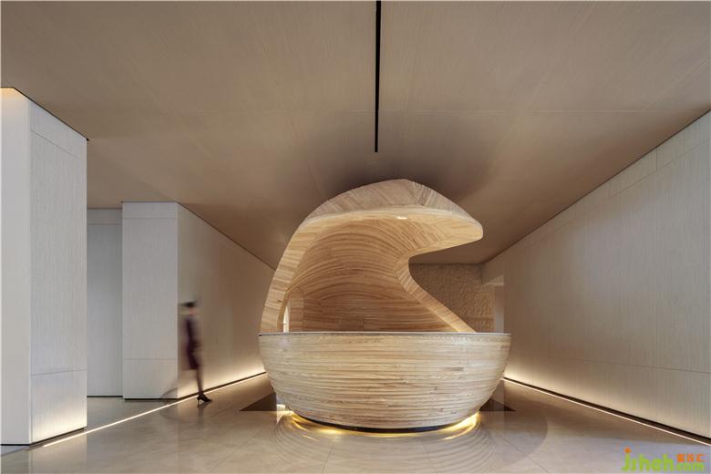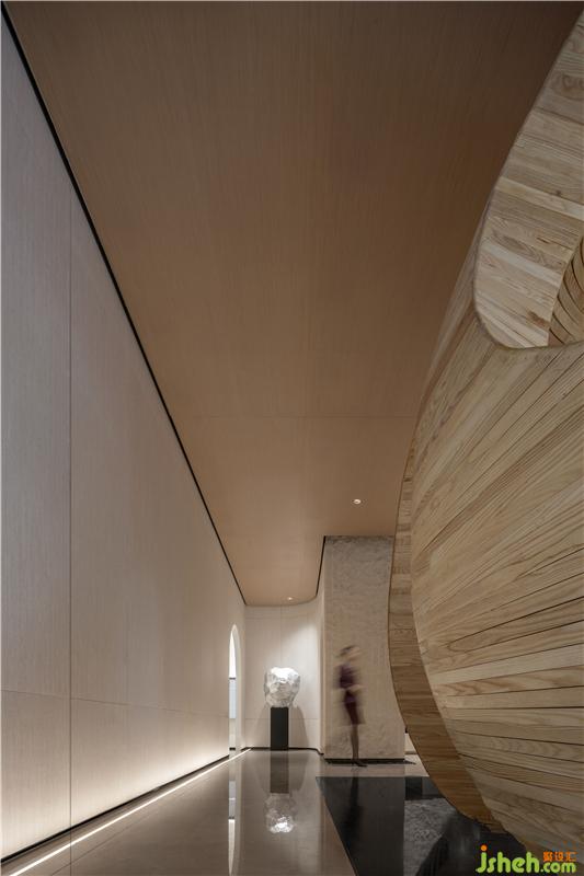水吧区打破一般的构造,售楼处设计将木质材料结合凤城奇山异石的形态,将水吧台变成空间中的艺术装置,打造项目独特的记忆符号。温润的材质与极具张力的表现形式结合,塑造了空间的场景感,体验别样的空间感受。