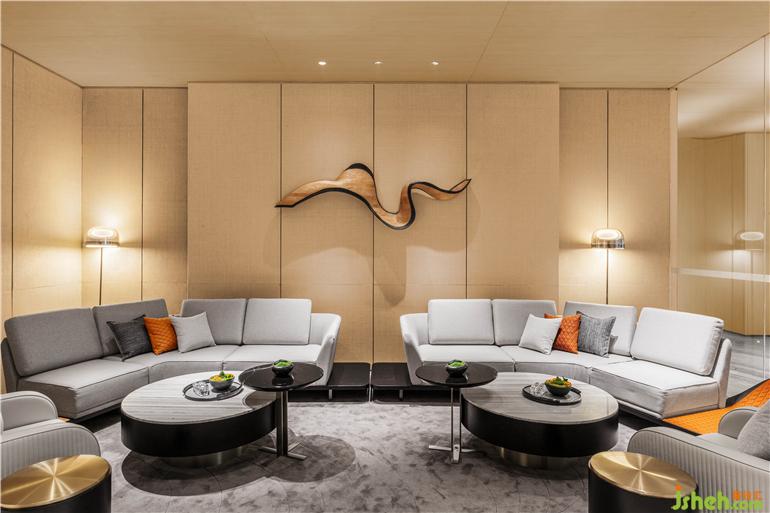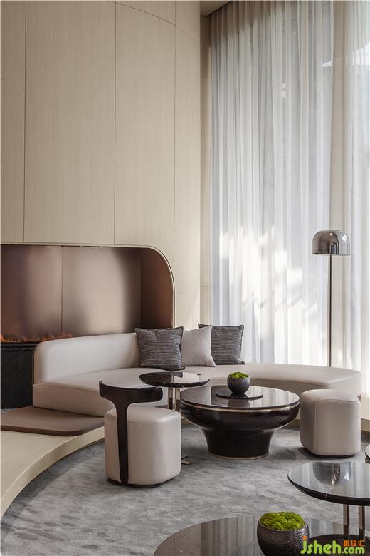 优美的沙发弧形结合大理石茶几,家具和艺术品在此相遇结合,东莞卓越悦山湖花园销售中心设计通过比例及材质,讲述自由生动的故事及情绪,打造悠闲的海湾生活方式。