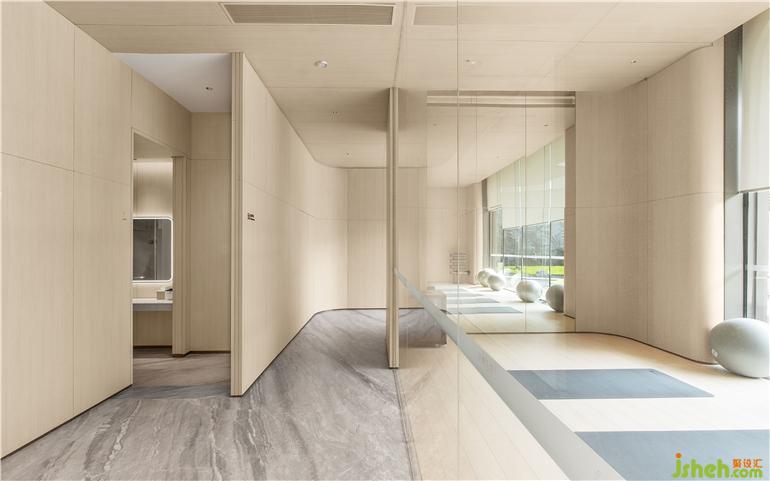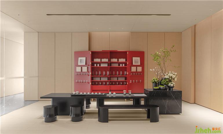 会所强调休闲交融的多维度生活体验,设置多功能空间。VIP洽谈区打造恬淡的茶室空间,红色茶柜宛如一个打开的宝盒,陈列着各样茶品,端庄红色点亮空间,与黑色茶台相互映衬。往空间中置放一抹绿,延续自然灵动。在河滨之上,留下了茶,这都都体现了建筑与水、游艇的紧密相融。