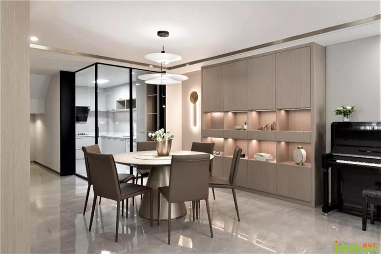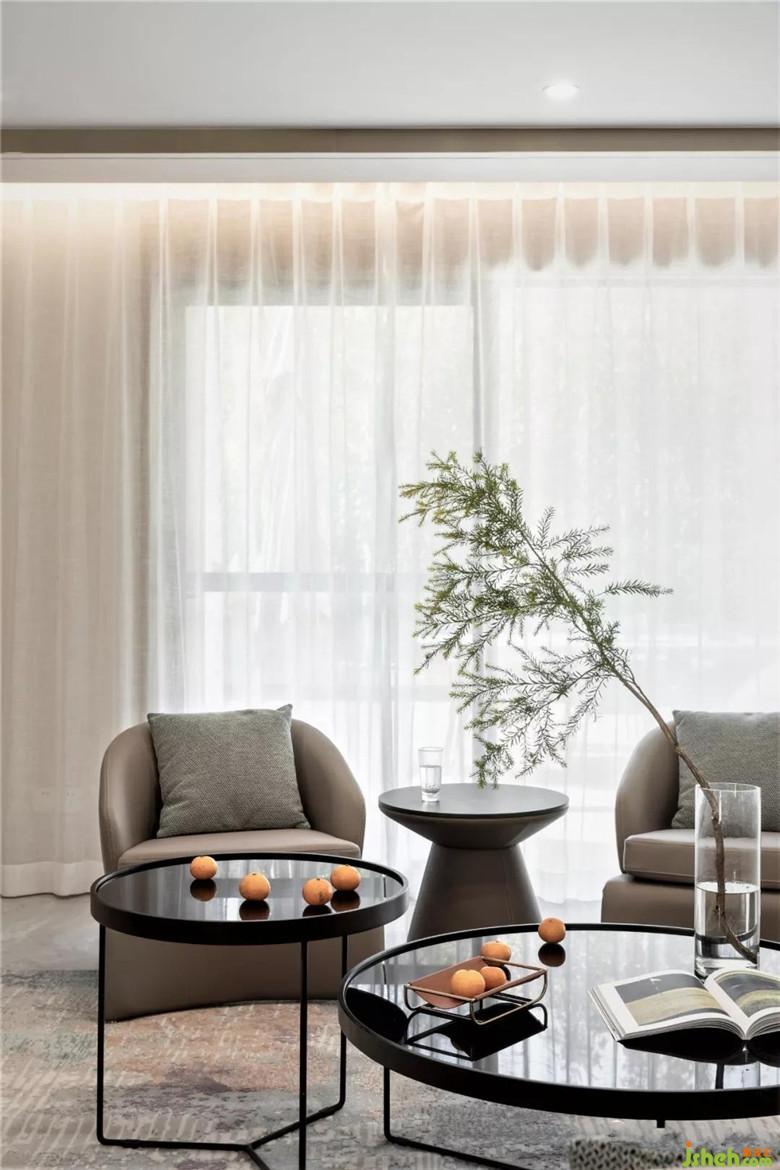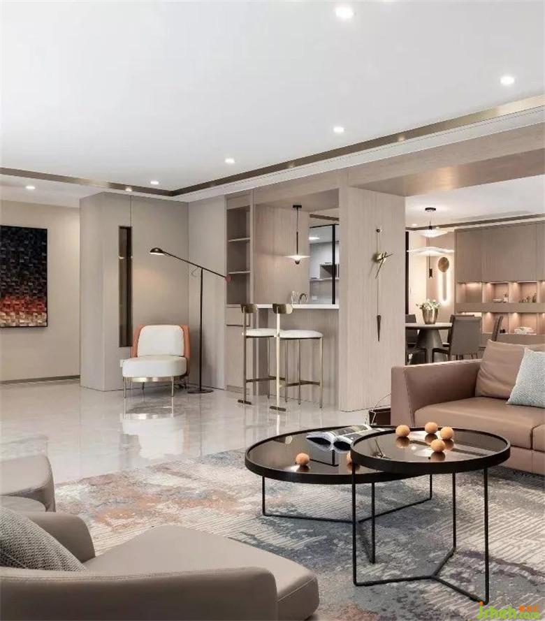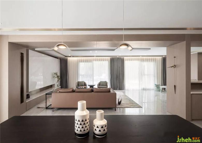 装修公司选择亮面大理石、哑光木饰面、中低饱和度的色彩搭配,让客厅显得静谧。大理石与不锈钢材质结合的电视背景,显得稳重轻盈且