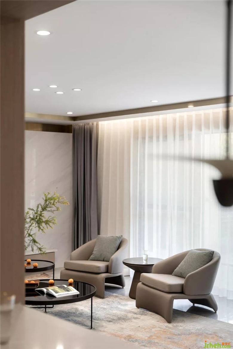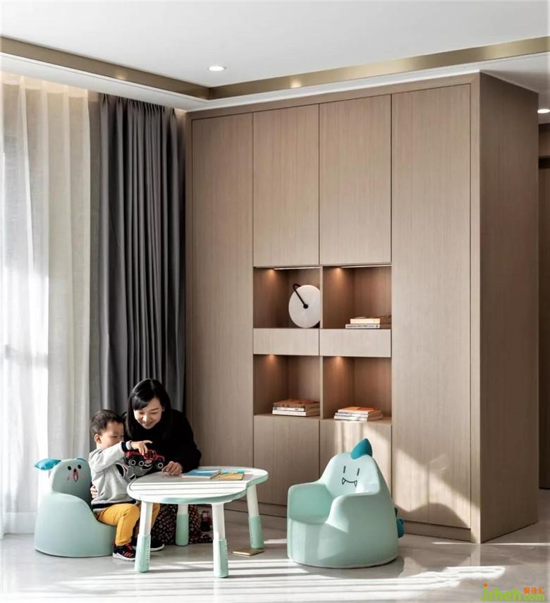装修公司对于会客厅的定位,一家人看看书或者一群人聊天,围合式的沙发布局,提升互动性。一抹橙色,几缕绿意,提升空间的柔和度和温度。