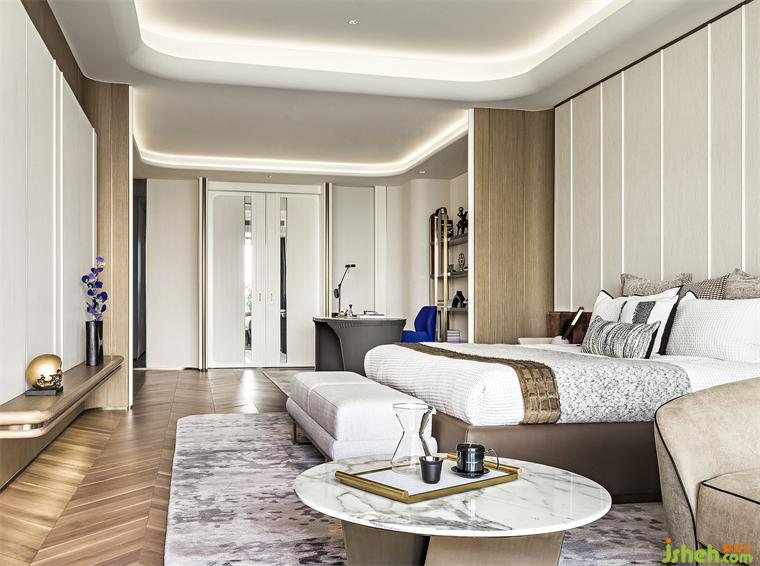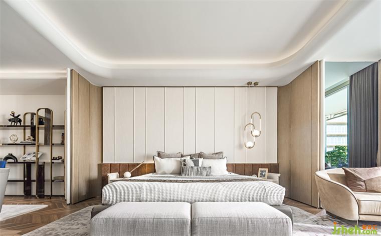 主卧强调品质与奢华共生的调性。樣板間设计沉稳且优雅,强调精神上的追求,而相同材质与不同肌理的碰撞更是可触摸得到的真实生活。