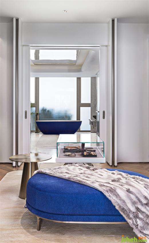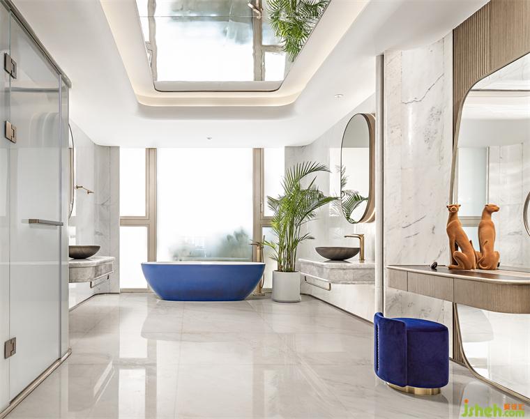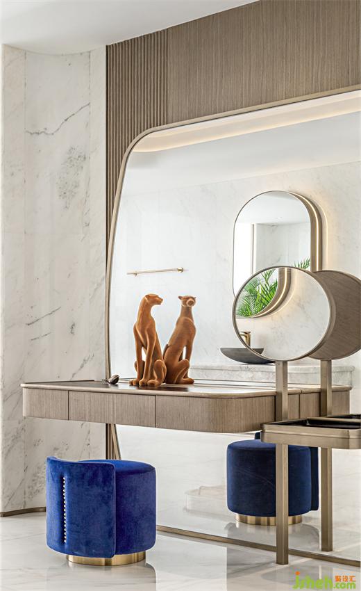 卫生间石材纹理灵动如水、色彩相互交错,拼凑成油画般的质感,樣板間设计让男女主人在轻奢中享受独有的美妙与浪漫。