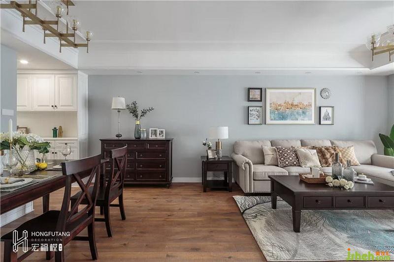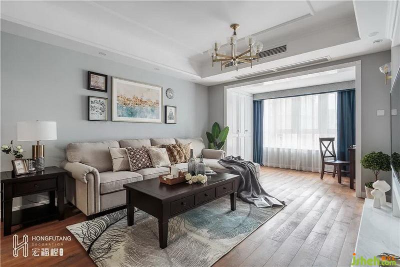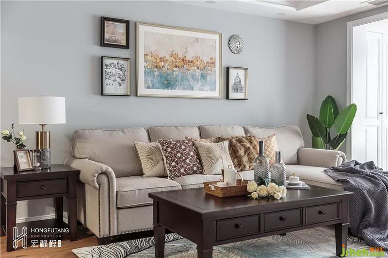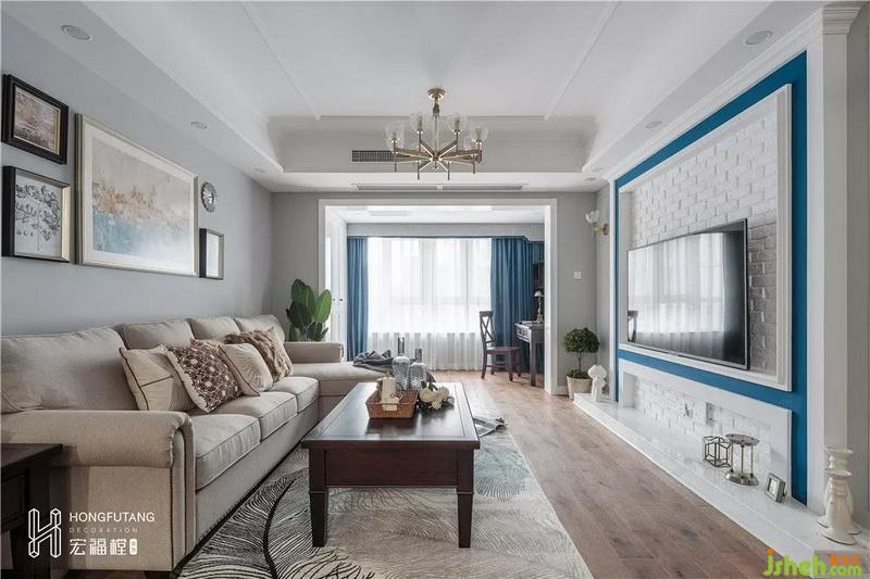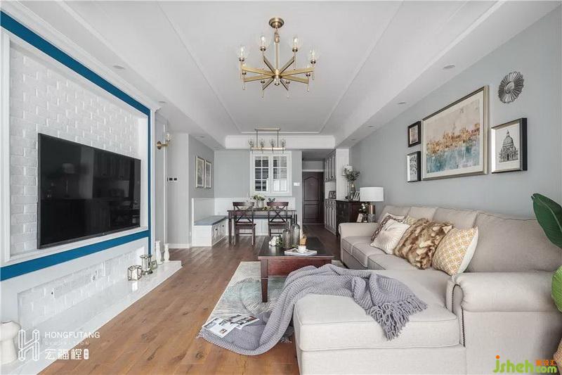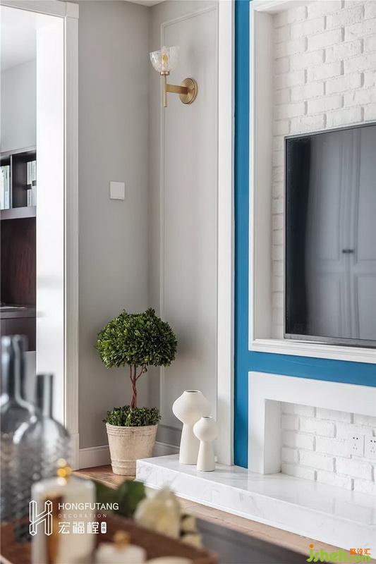 为保证足够的开阔感,客厅以灰白棕为主色调,自然干净的灰色墙体与沉稳安静的木质地板相呼应,再搭配深棕色的茶几边几,色彩搭配轻重和谐,简约的同时又不失格调;选择彩色油画作为沙发背景,缓解了视觉上的清冷;浅棕色的沙发与羽毛地毯带来一种温暖与浪漫的感觉;影视墙以白色砖面为主,搭配蓝色线条,清新明朗,选用壁灯设计,增添氛围灯光的同时,也避免了墙面的空白,精致的小摆件显示着业主的品味和对质朴生活的理解。