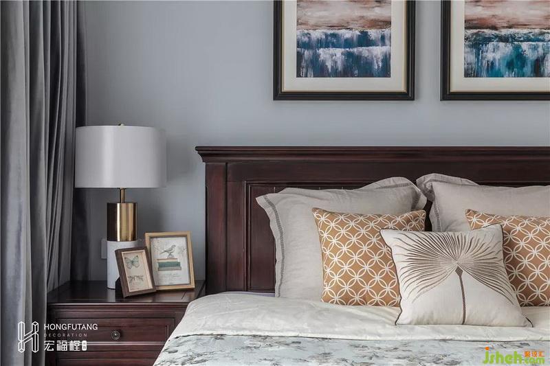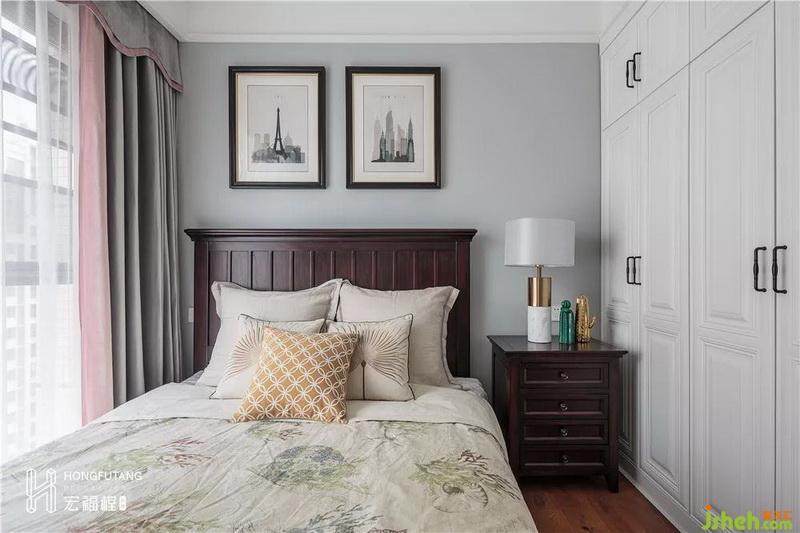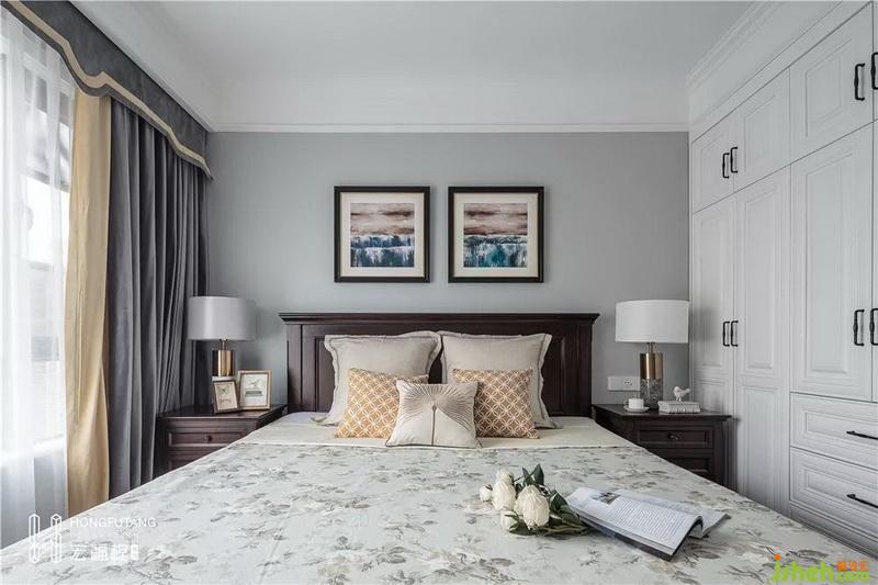 主卧延续整体风格,色调安静温柔,木质的床头柜与床头靠背又提升了家居品味;窗帘采用金色、灰色双层相间,既不影响采光,又保留了卧室的私密性;同时,拆除了主卧过道门垛,扩大衣帽间,增加空间利用率的同时又与休息区域隔开,互不打扰。
