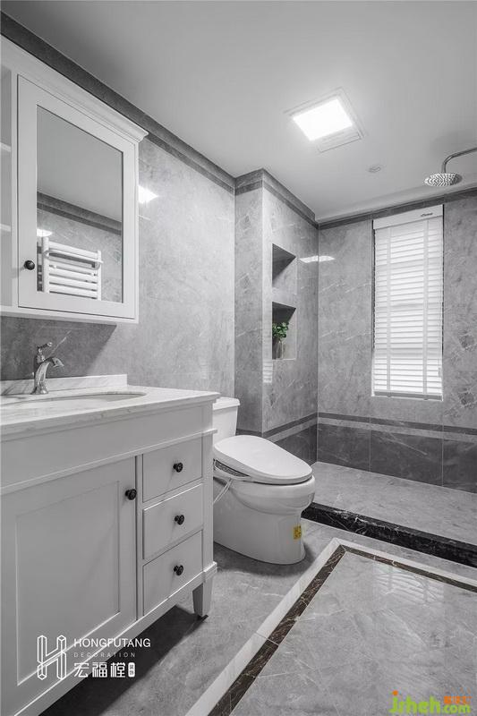 卫生间采取了灰白色调,整个空间干净整齐,突出现代感;淋浴间的墙壁设计为两个嵌入式空格,上层作为洗浴用品收纳,合理利用空间,减少占用,下层摆放一盆绿植,为整个空间带来一份生机和活力,弱化灰色带来的生硬感。