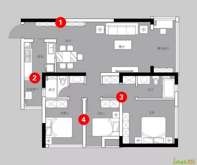 为最大限度增加储物空间、把现有的空间开阔化,将原来衣帽间与次卧的隔墙拆除,由一个次卧增加至两个次卧,并将另一个次卧的空间扩大。次卧的窗帘选取灰粉色,整个空间的清冷气息就会瞬间变得舒缓起来,散发着一股难以抗拒的轻熟魅力,与主卧相区分;依靠墙壁打造了一面收纳柜,增加储物空间。