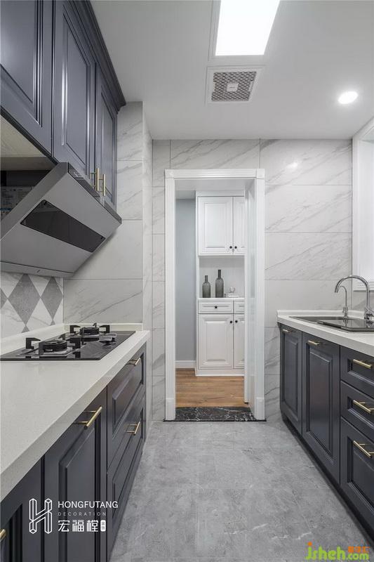 原来的厨房空间狭小,为扩大厨房空间,将厨房向生活阳台扩展了320mm;橱柜靠墙相对而设,从厨房门口望去,原来狭小的厨房便能给人一种通透的视觉效果。