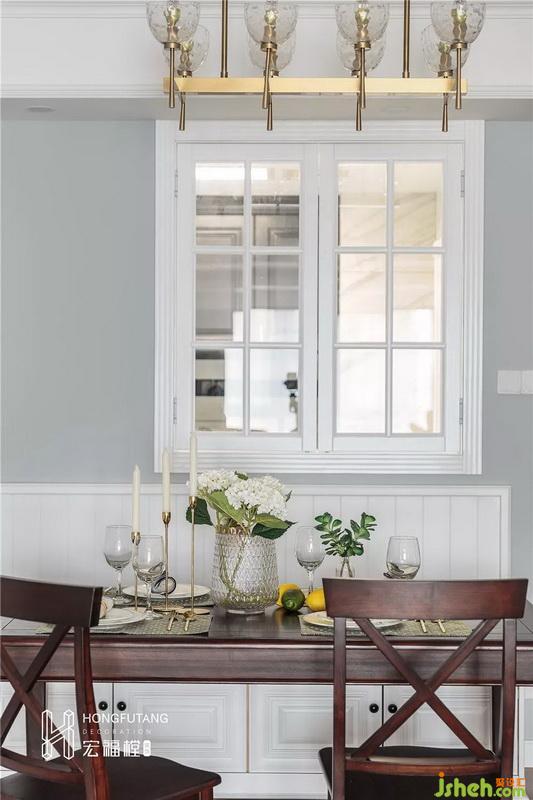 餐厅与客厅处于同一空间,也拥有着来自阳台的充足阳光。餐桌延续茶几边几同色调的深棕色,选用卡座搭配座椅,既可增设餐厅用餐座位,又利用卡座下方增设储物收纳的空间,其线条感也为整个空间增添了一丝美式氛围。