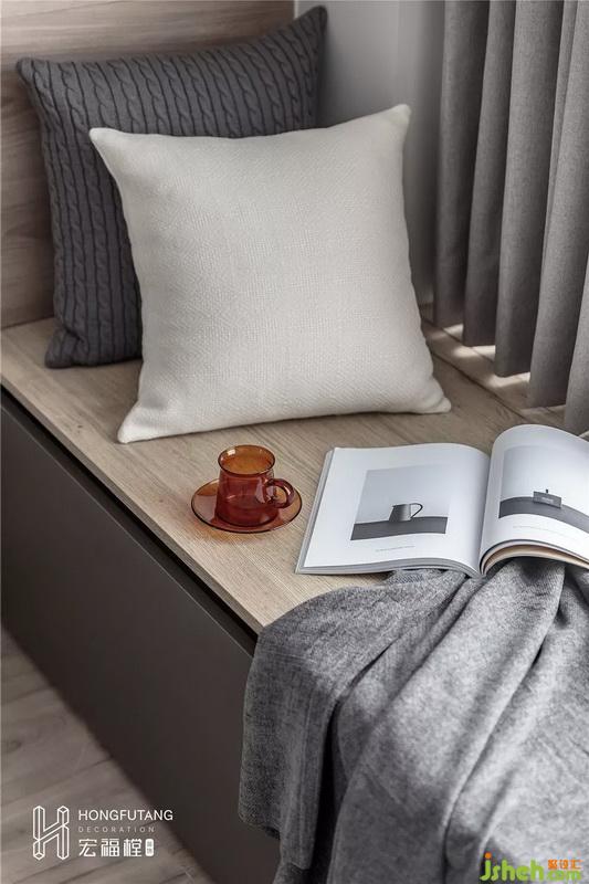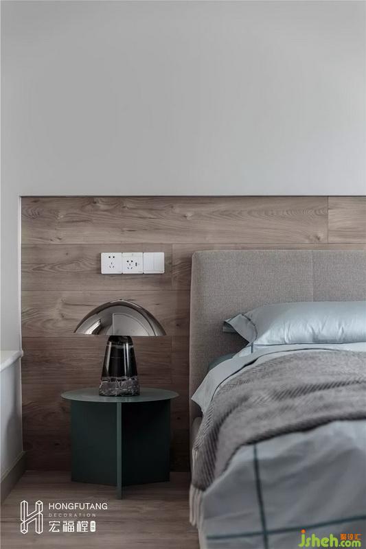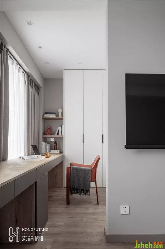 主卧空间容纳了可变空间,主卧的功能性更强,将衣帽间、书房都融入了整个主卧,合理的尺度布局保证了空间的功能性和舒适性,扩大了主卧的收纳空间;卧室没有多余的装饰,空间背景墙选用上下分隔的样式,空间层次感更强,根据日常习惯设置比例,保重空间美观和实用度;为保证空间材料的统一性,窗台面板也选用木质材料,提高空间质感;书桌靠窗连接窗台设立,在有限的空间内,将主卧实用性最大限度使用。