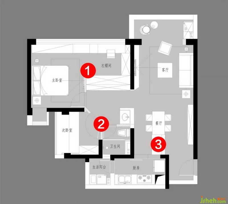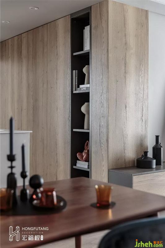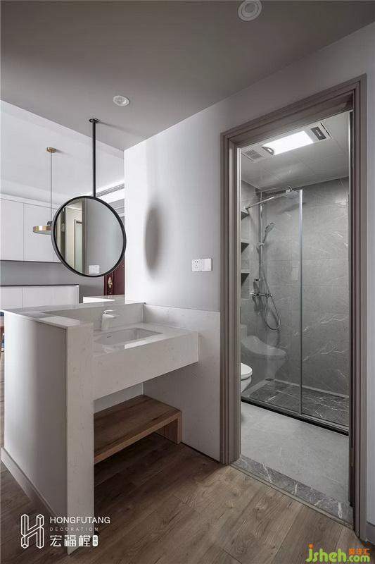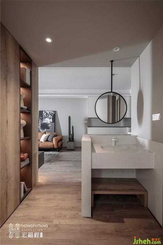 原始户型中需要通过卫生间进入次卧,不仅影响使用,也不利于两个空间布局,设计师将次卧入口独立,由走廊空间直接进入;卫生间选用开放式干湿分离,将干区空间融入走廊及公共区域,增加客厅的视觉通透性和走廊的视觉舒适性,也不影响空间使用功能,满足日常生活需求。