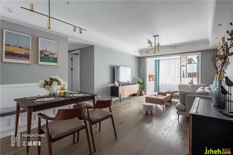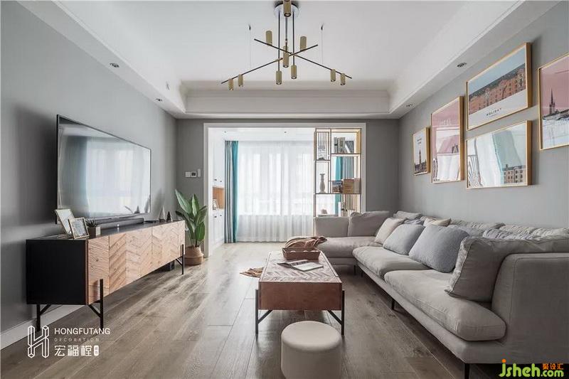 客厅面积较大,以灰色和棕色为主,整体色调轻松舒适,灰色自然干净,木色的选用让人感到清新安稳。选用浅色软装搭配助于扩大视觉空间,且不会使得空间色彩过于突兀。
