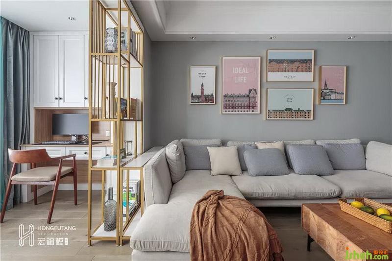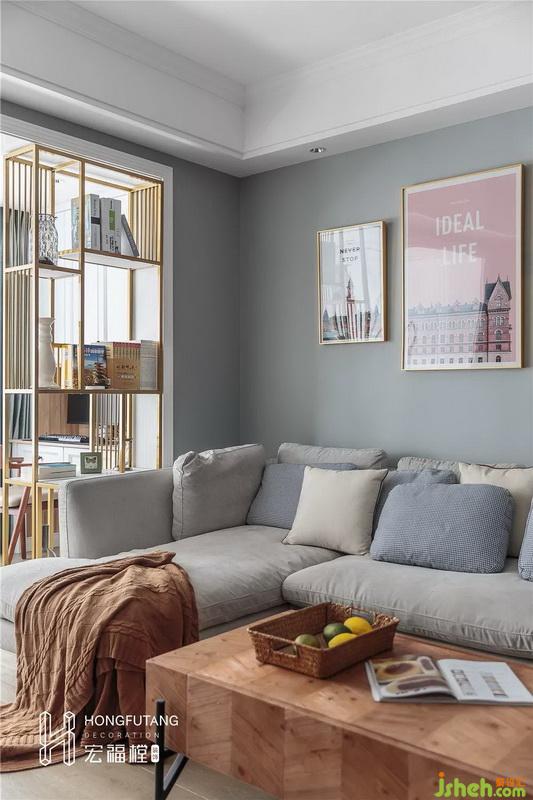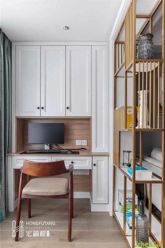 为合理利用空间,将阳台作为书房使用,用一个较窄的书架隔开客厅和书房,在这里给一方自由的工作天地。书架既起到了隔离的作用,也起到了装饰的效果,提升了整个客厅的品味,书架的选用比墙体更为通透,还能作为置物架使用。靠墙两侧一侧作为书桌使用,一侧放置顶天地柜,作为收纳使用。
