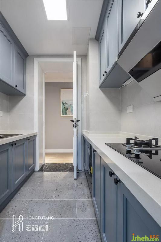 设计公司考虑到原来厨房空间不足,将厨房往生活阳台移动320mm后,扩展了厨房的使用空间。增设橱柜和操作台面,更有效地利用了厨房优先的空间。另外,由于厨房外为过道,采用白色实木门,提高了入户的舒适感和隐蔽性。