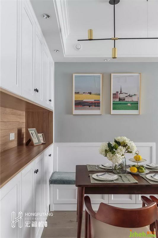 餐桌的凳子一边采用柜式的座椅,一边采用同套的椅子,既合理节约空间,又满足了日常使用的座位;餐边柜与鞋柜相连,中镂空部分可以用于放置小型餐厨工具,封闭柜子可作为公共收纳空间使用。