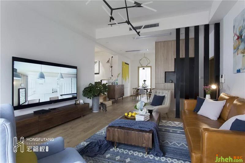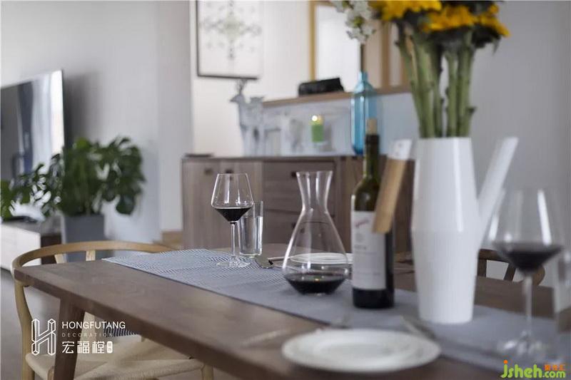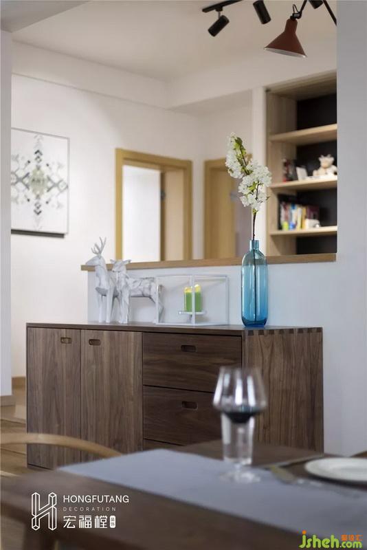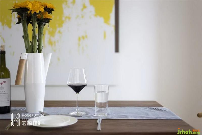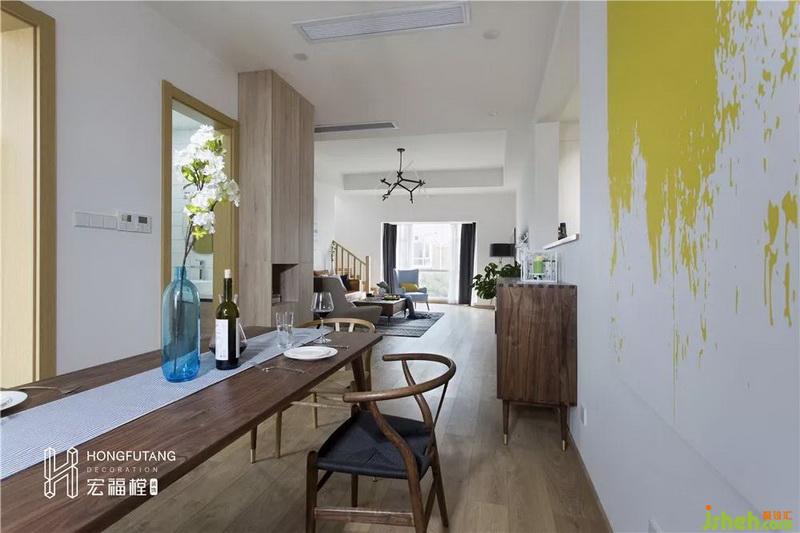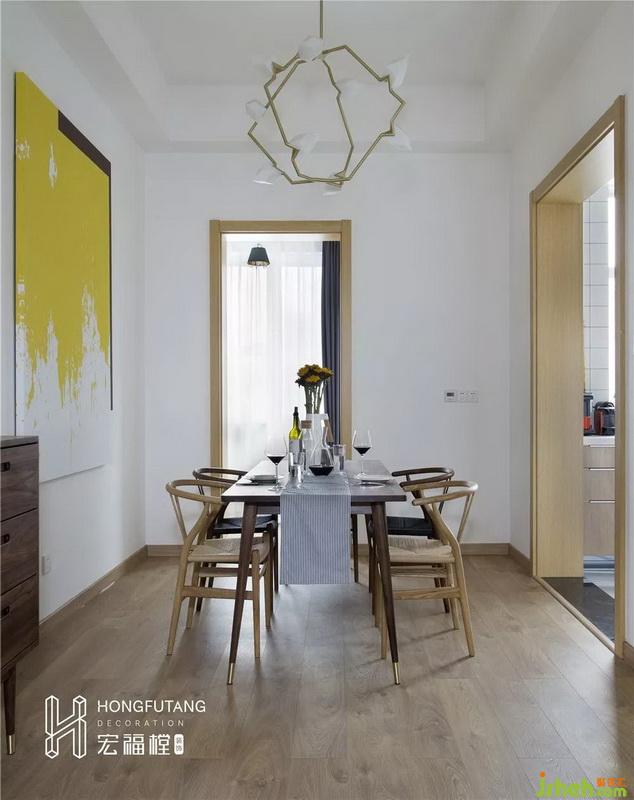 餐厅空间较长,所以在餐桌的选用上,选择有长方形餐桌可以顺餐厅空间摆放;左侧靠书房留白区域设立斗柜,可达到摆放物件和收纳使用;整个空间过于空白,在餐厅墙面选用色彩艳丽的明黄色壁画提高餐厅的明度,活跃餐厅空间。