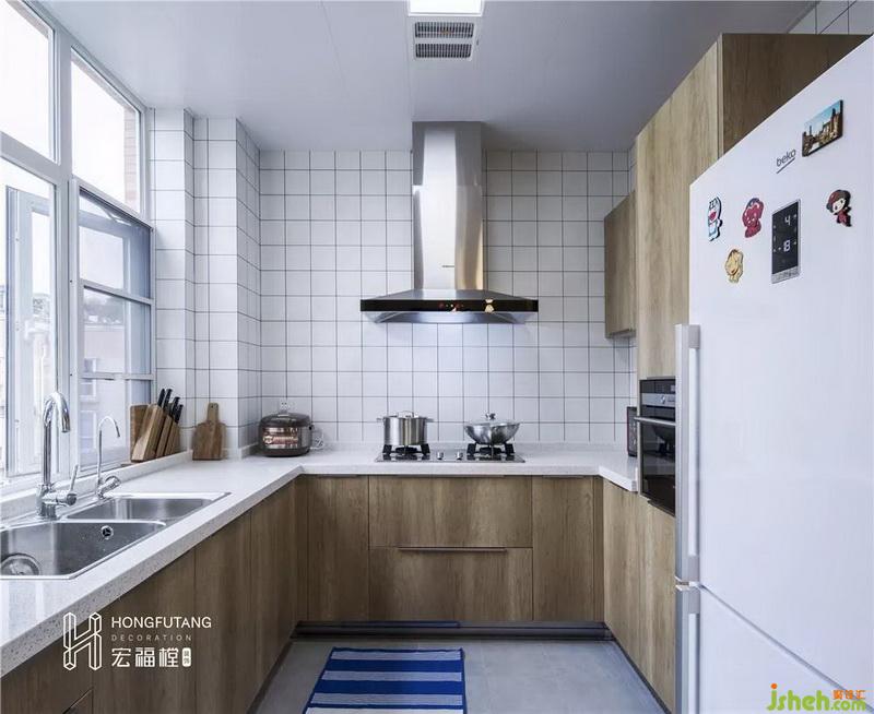 厨房进门方向由西面改至北面,进门方向的变动,解决了橱柜地柜的操作问题,提高了厨房空间利用率,与餐厅之间划分了更为合理的动线,也为公共卫生间洗漱池的增设预留了位置;这个改造利于三个空间和谐布局,划分更加合理。
