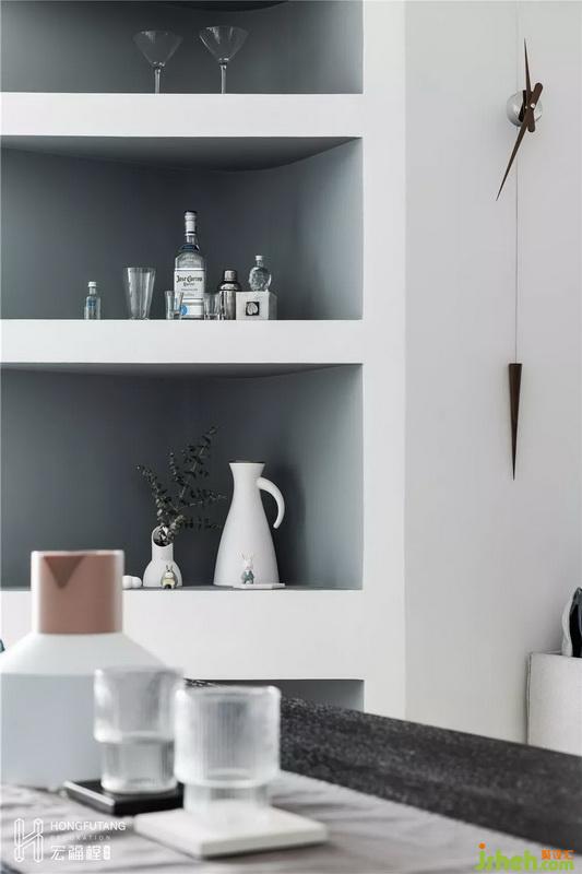 餐厅空间狭长,餐厅与窗子位置呈异型,从风水学和日常使用上来说,浪费空间且不适用于常规改造,所以将餐厅到窗子之间的两个大阴角做整体壁龛,可代替定制酒柜,用于物件陈设收纳,切面设计使空间更整体简洁。