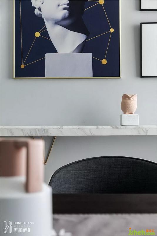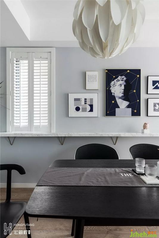 餐厅背面窗外为另一栋楼的立面,视线受阻,价值窗户的位置不利于构图,在设计时考虑利用木质百叶窗和拉通的石材隔板将整个餐厅背景墙构成一个整体,保证了风格的一致,简洁大方。