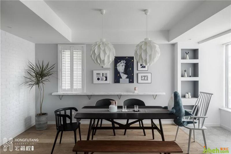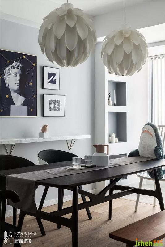 餐桌选用长桌,一是能增添用餐人数,二是考虑到餐厅空间面积,避免留白过多,视线太空;餐椅选用四人单椅搭配横凳,横凳占用空间小,为客厅和餐厅留出过道空间。
