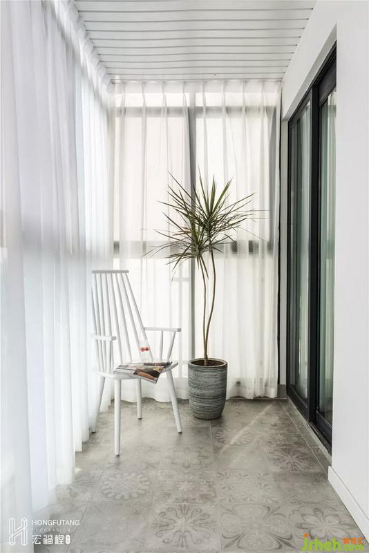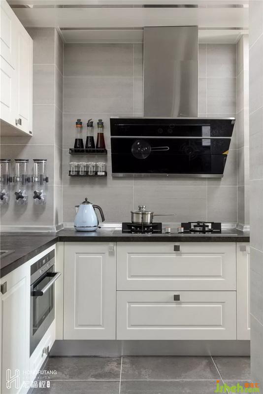 厨房面积较小,加之承重墙的原因,厨房无法从内向外扩大,只能将厨房向生活阳台延伸,增加一组1m台面,可用于摆放厨房的小家电,缓解厨房压力;因为生活阳台开间比较小,为了缓解转角空间的逼仄感,将直角改成斜角,扩大空间感。