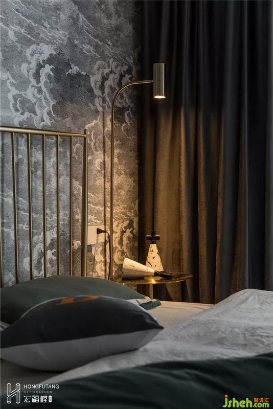 老人房选用网红款乌云墙纸,搭配金属材质家具、棕色衣柜,深浅交错,整体空间更整洁大方有层次感,墨绿色的选用符合房间沉稳冷静的空间气质。