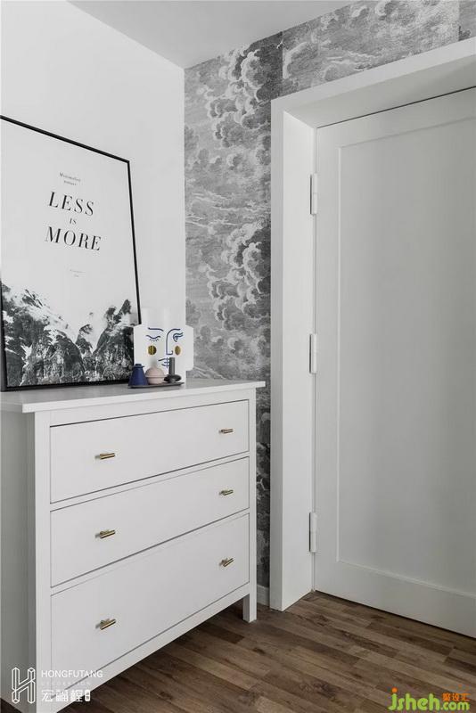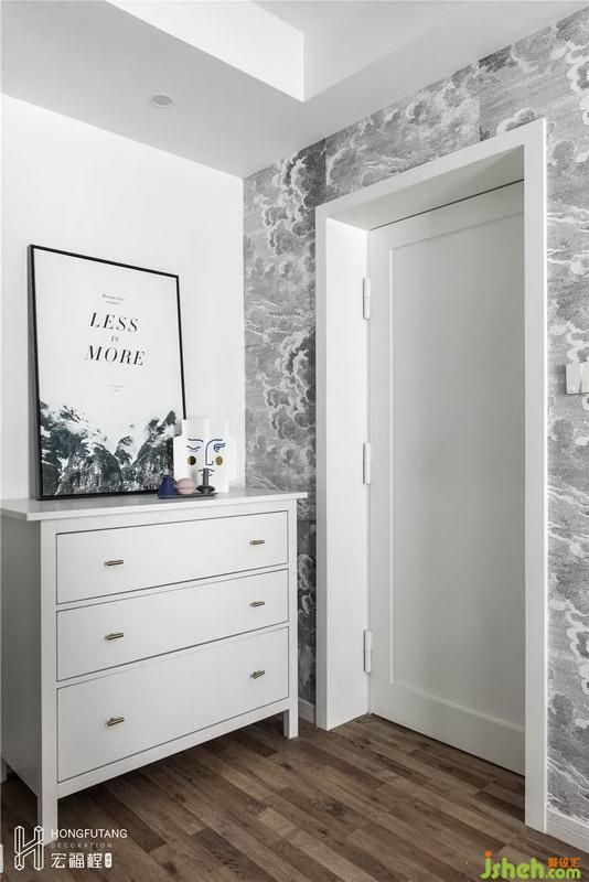 老人房位于客厅背后,将原有储藏室与老人房合并,扩大到15.5㎡,将原有的储藏间的位置改造成开放式的衣帽间,因为储藏间部分墙体是承重墙体,加之强电箱的位置也在墙体上,所以利用原有墙体的位置与新门洞隔墙的位置打造小景观区,放置斗柜,方便收纳。