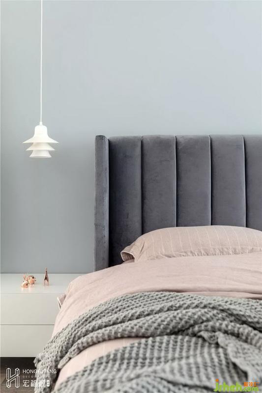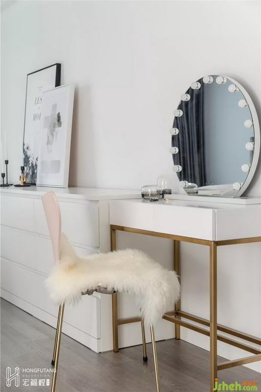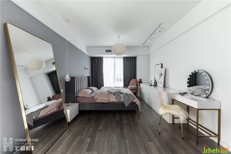 主卧空间色彩选用灰色搭配灰粉色,相比老人房更加温柔,现代风格融入其中;主卧内选用的穿衣镜、少女心梳妆台都是女主人的喜好。
