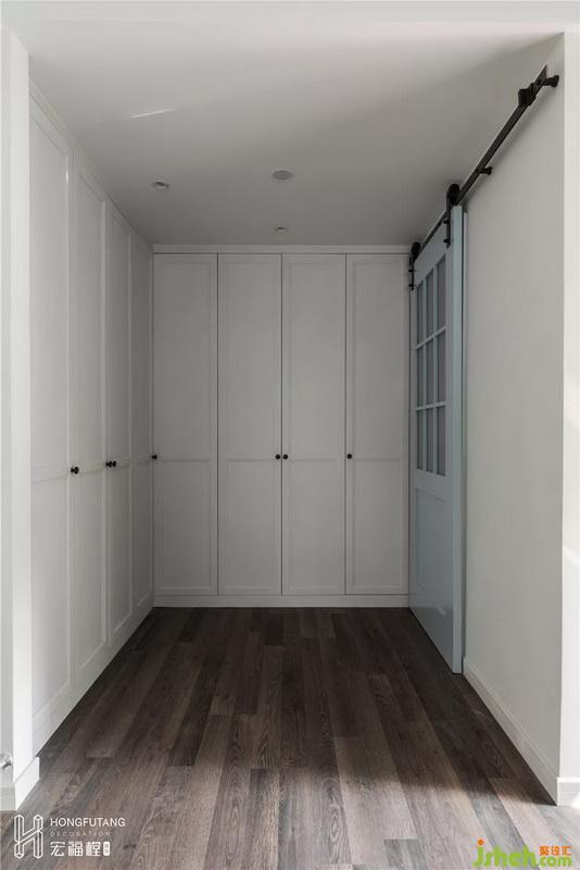 主卧衣帽间呈L型,靠两面墙做收纳空间,尽可能扩大衣帽间的同时也与休憩空间互不打扰。