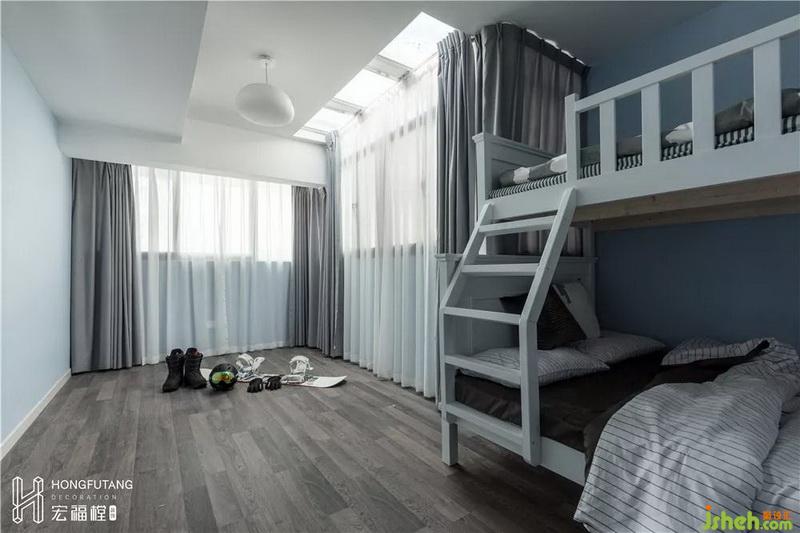 儿童房没有摆放过多的家具,选用子母床,节约空间,剩余空间都可作为小朋友活动玩耍区域。