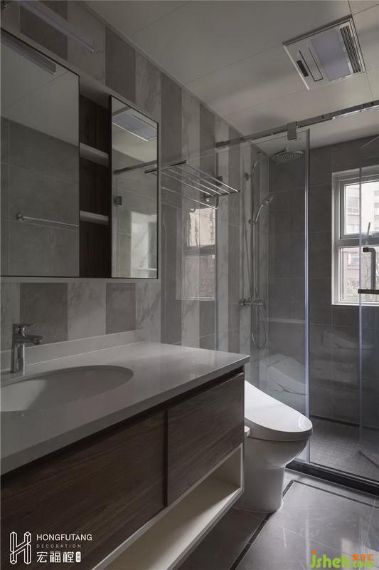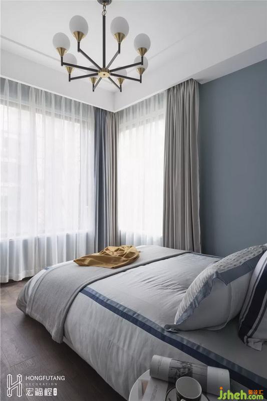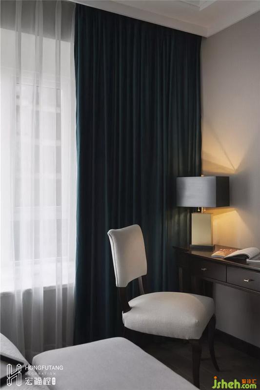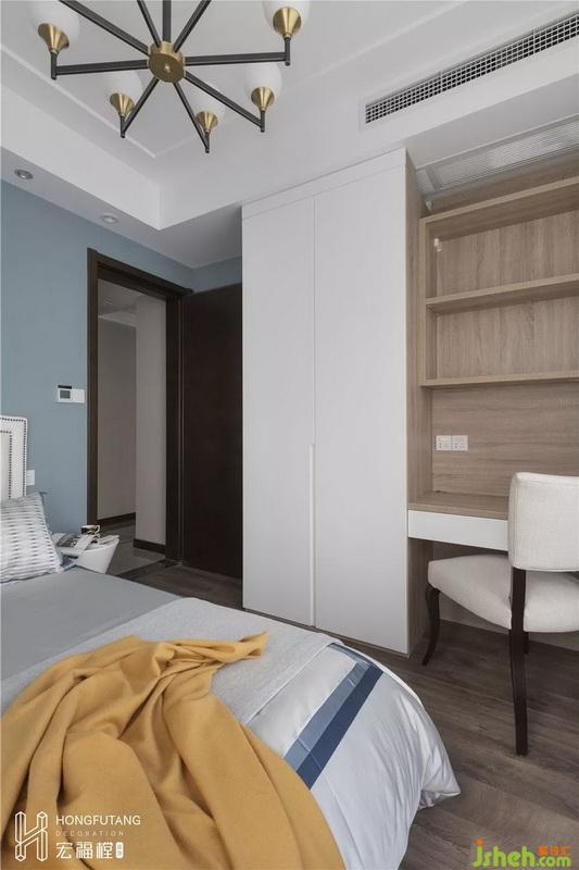 书房也可作为客房使用,依灰蓝色墙面为主,利于空间的采光;书桌和衣柜采用一体式,满足日常办公、学习的同时,也能书籍收纳、衣物收纳的功能。