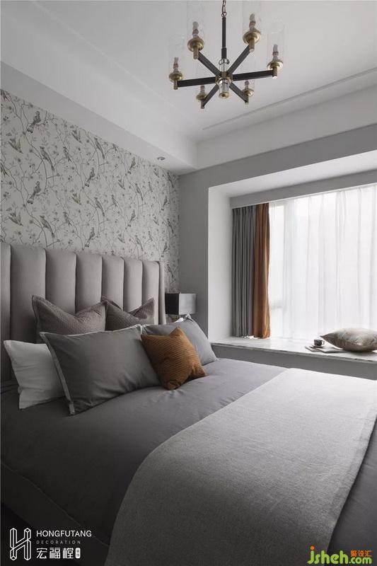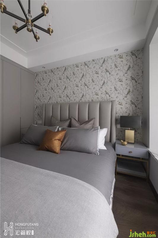 考虑到次卧主要为老人居住,所以颜色风格温和,选用花鸟壁纸,为整个空间带来生气;选用土秋香这种热烈的颜色小面积出现在软装处,提亮空间色彩;床头选用软包皮质,符合人体感知度,老人使用时更加舒适,减少磕碰。