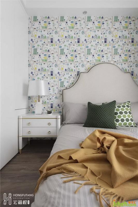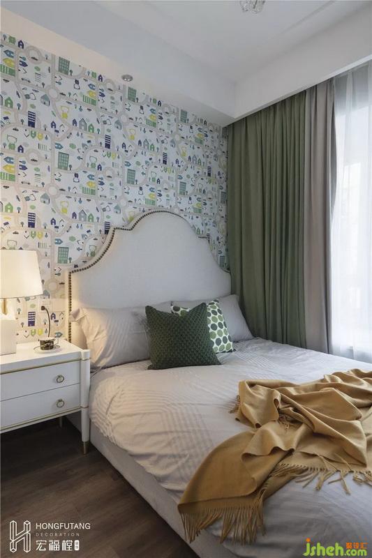 儿童房空间有限,所以一侧靠窗边摆放,节约空间;矮床的选用,减少小朋友摔下床的安全隐患;童趣壁纸活跃空间背景,软装选用绿色,空间更有生机活力。