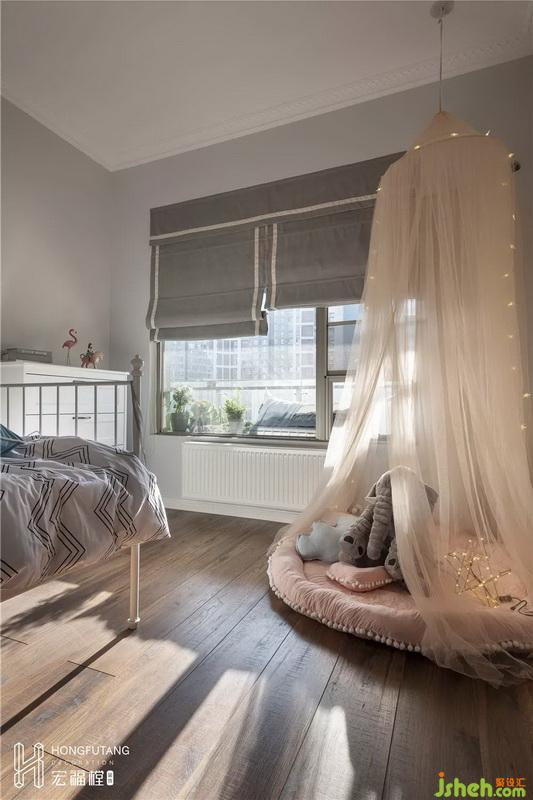 女儿房空间有限,所以选用斗柜作为衣物收纳,减少空间占用的同时方便物品拿放;选用铁艺床,节约空间的同时,也便于日后女儿长大更替家具;右侧角落采用印第安帐篷打造玩具区角,将空间合理规划,便于日常整理。